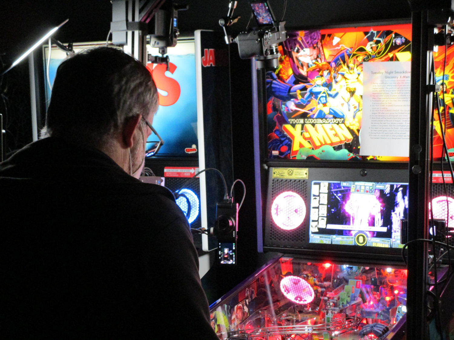 The league seems to be growing again as we had more new new players: Darien (Linda’s neighbor, if I’ve got this right), who has played pinball a long time but never in competition; Luc, whom I didn’t get to talk to very much yet; and mother-daughter combo Kim and Payton. Some of the new players were curious about Peter’s streaming rig, which made another appearance tonight, and I was excited to explain to them that people stream pinball on Twitch.