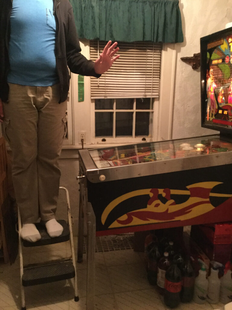We had a new game in The Avenue this time – well, sort of. For some reason we now have a second Godzilla, so our original Godzilla LE is still in the alcove, and the new Godzilla Premium is upstairs. The gameplay is the same between the two models, so the only reason to have both is is that there is one free while Danny is in the building. The rule is that we always use a new game as our Tuesday Night Smackdown side tournament game, so I decided that extended to the Godzilla Premium, or as Joseph has dubbed it, “Mezzagodzilla.” (Godzilla on the mezzanine, get it?) We also were playing Godzilla in one of the two banks, so it was a Godzilla kind of night. Joseph wrote “You’re welcome, Danny” on the rules sheet for the Smackdown tournament.
