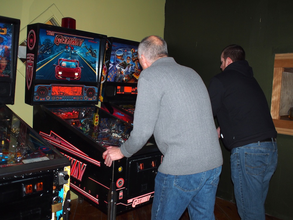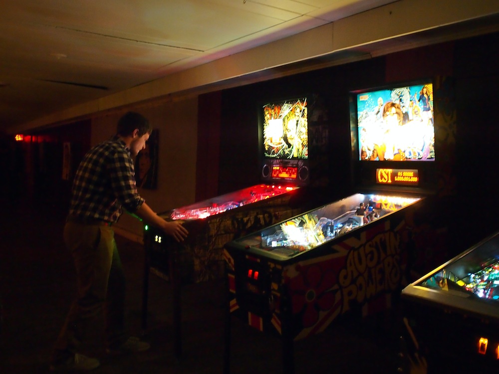 Chris and Mike enjoy a well-lit pinball alcove for a split second as my flash goes off. Sadly, they were plunged back into darkness immediately afterward.