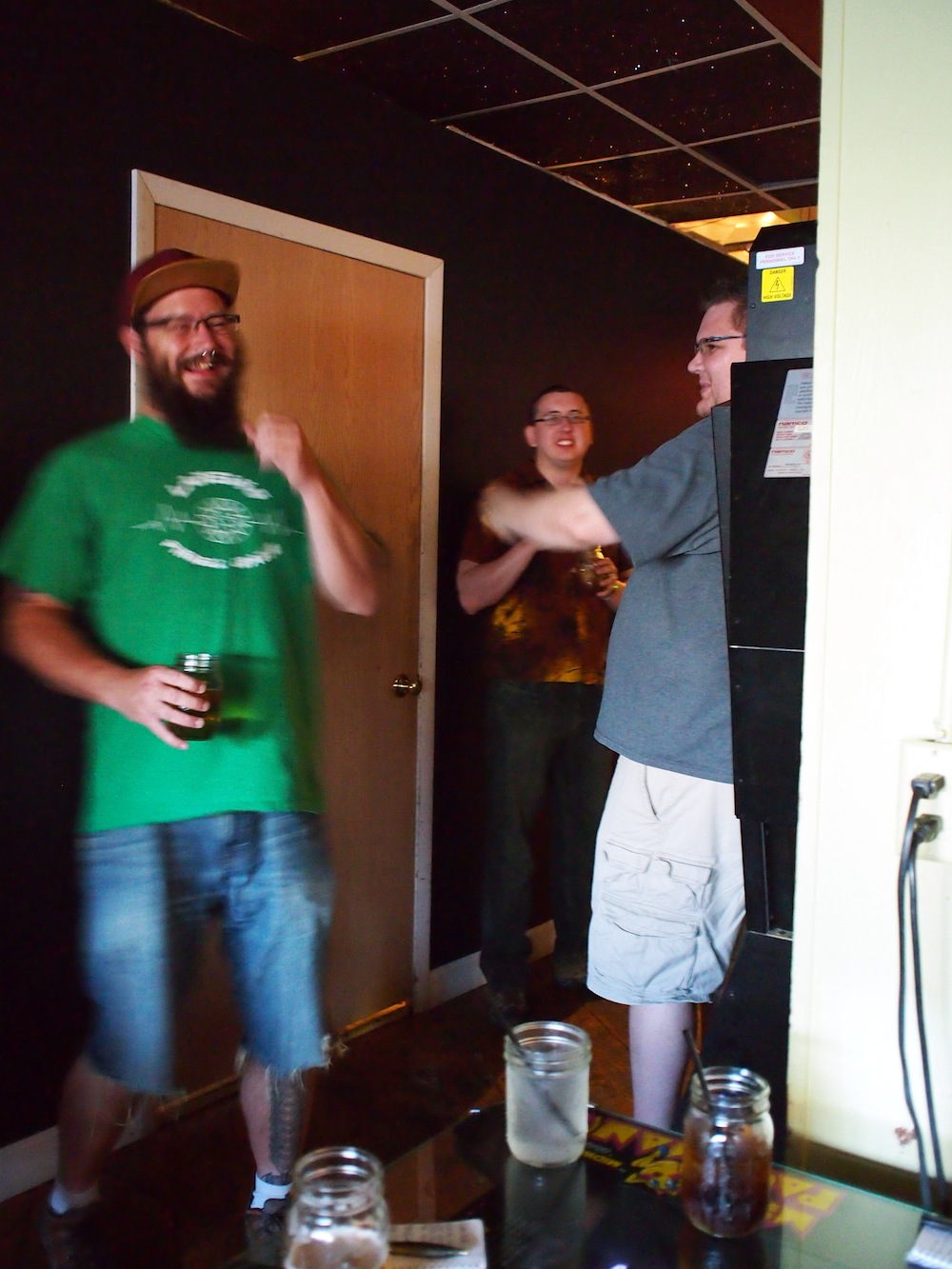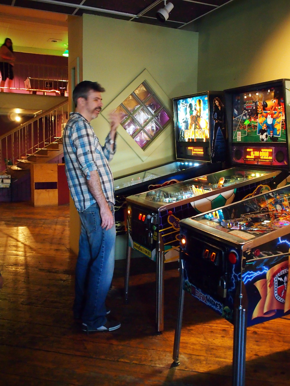 The last game of the night for my group was Medieval Madness.  We had to wait a while for the prior group to finish.  Eventually they were down to their last ball and the final player, Jake, was nowhere to be found.  Someone looked around for him and eventually found him hanging around out back with a crowd of folks whose games had finished.  It turns out he had pulled a Mike S., thinking his game was over when he actually had a ball left.