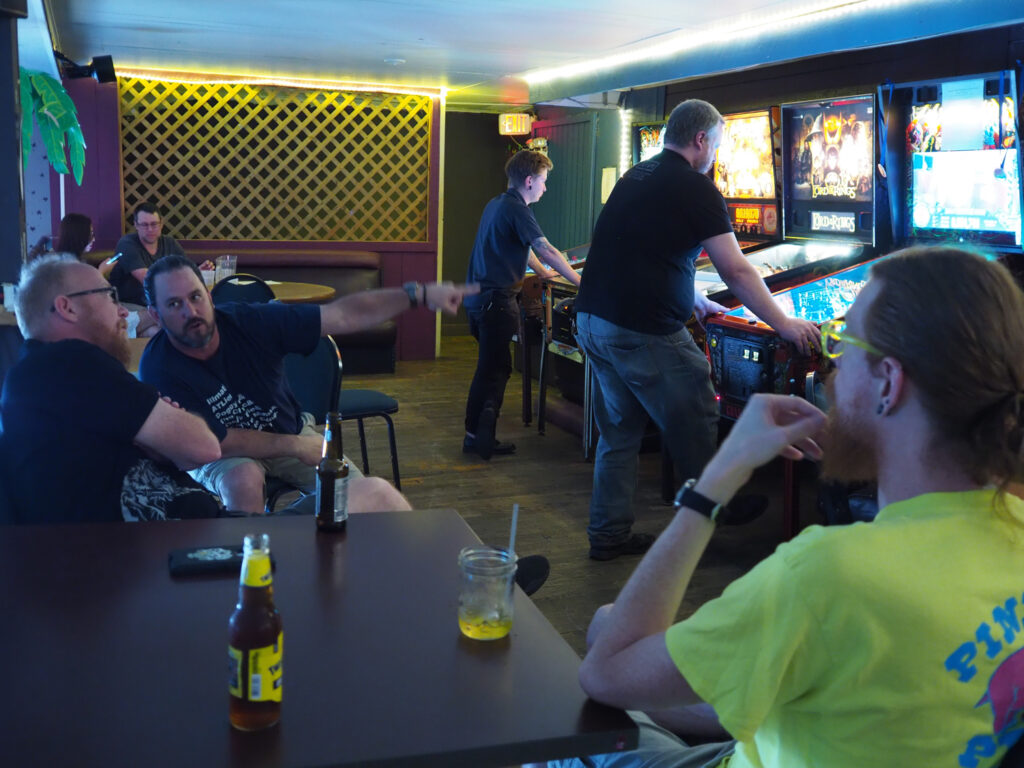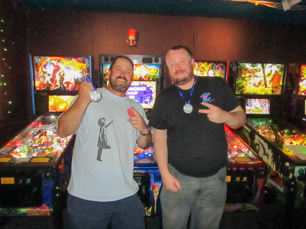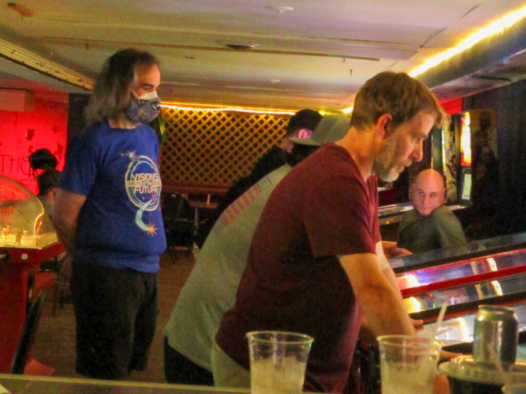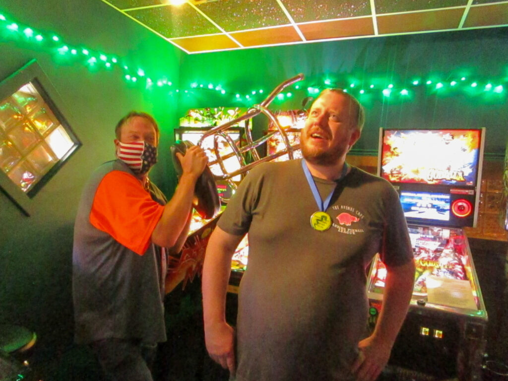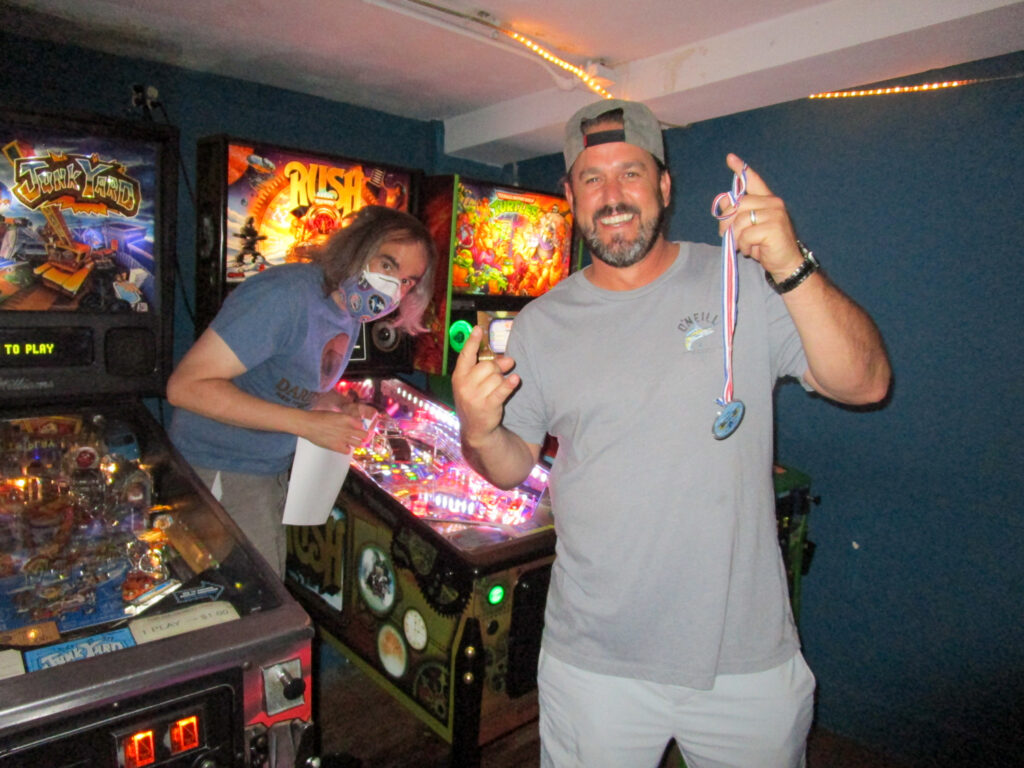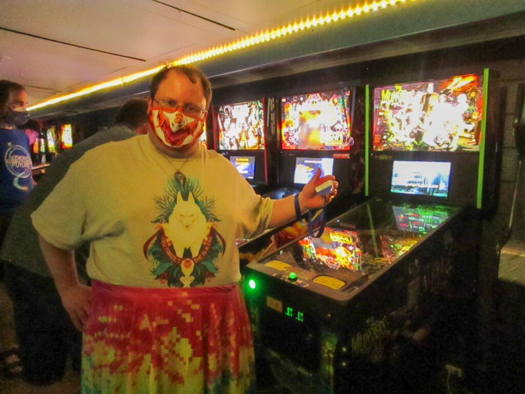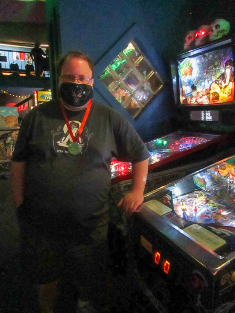 The team that did end up dominating my-and-Heather’s night would be the dream team of Josh and Jason, whom we ended up playing three times. They knocked me and Heather into the Second Chance bracket, but we came right back to give them their first loss. And that was on their picks of Willy Wonka and The Mandalorian, games I didn’t know you could play split-flipper worth anything. And then, just as we were feeling good about our chances, Josh and Jason knocked us dead on Munsters and Getaway, the two games we thought our best bets. But this let me extend the tradition of trying my hardest to look like a good sport after losing in finals, so that’s nice.