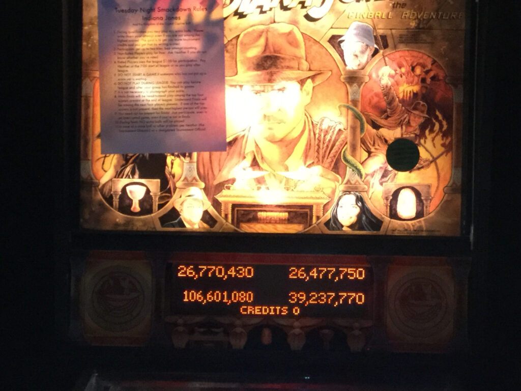 Our most recent league night closed out the third quarter of the season as everyone finished playing either Bank 5 or 6. (Except for one person; more on that in a bit.) We also had a Tuesday Night Smackdown bout on one of the league’s classic games, Medieval Madness. While it’s not the same physical game as the one that the league started with, Medieval Madness was one of only four titles in the bar when the league started. The others were Lord of the Rings, Indiana Jones, and Johnny Mnemonic. Tales of the Arabian Nights was the next one added soon after. All were located in the alcove. While sadly, Johnny has “gone up the middle” straight out of the venue long ago, the others have never left. Except, that is, for Medieval Madness, which was replaced by a version that has never been quite as friendly to me. That’s your league history lesson for today.