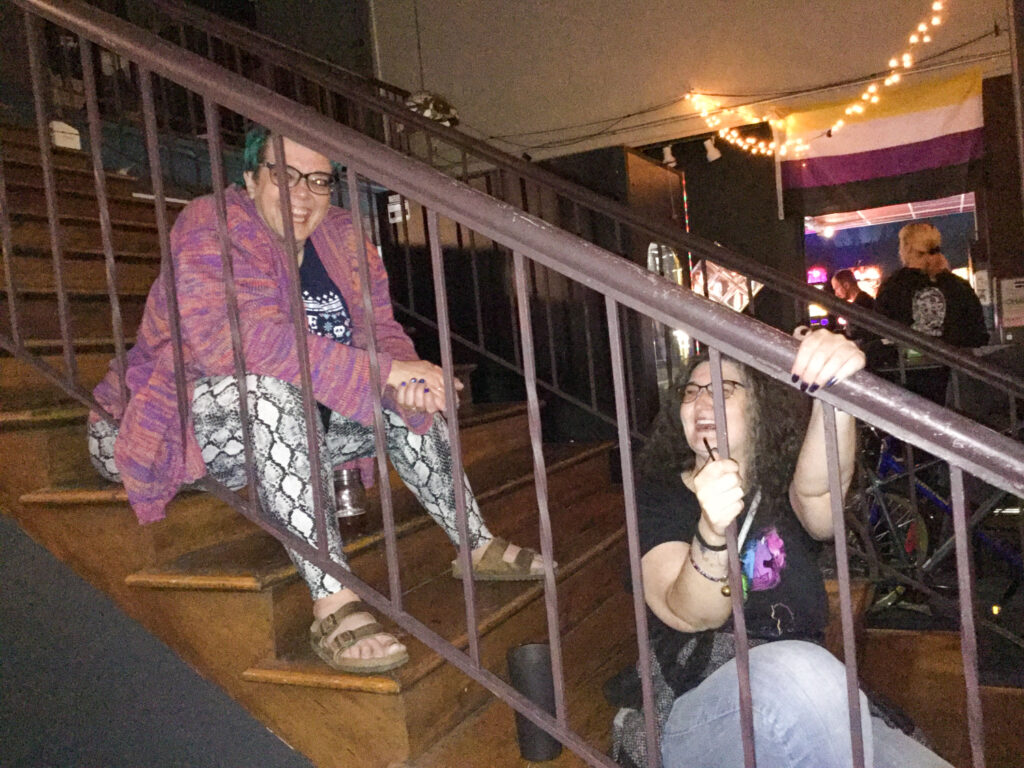 Linda and Cyndi hanging out on the stairs.