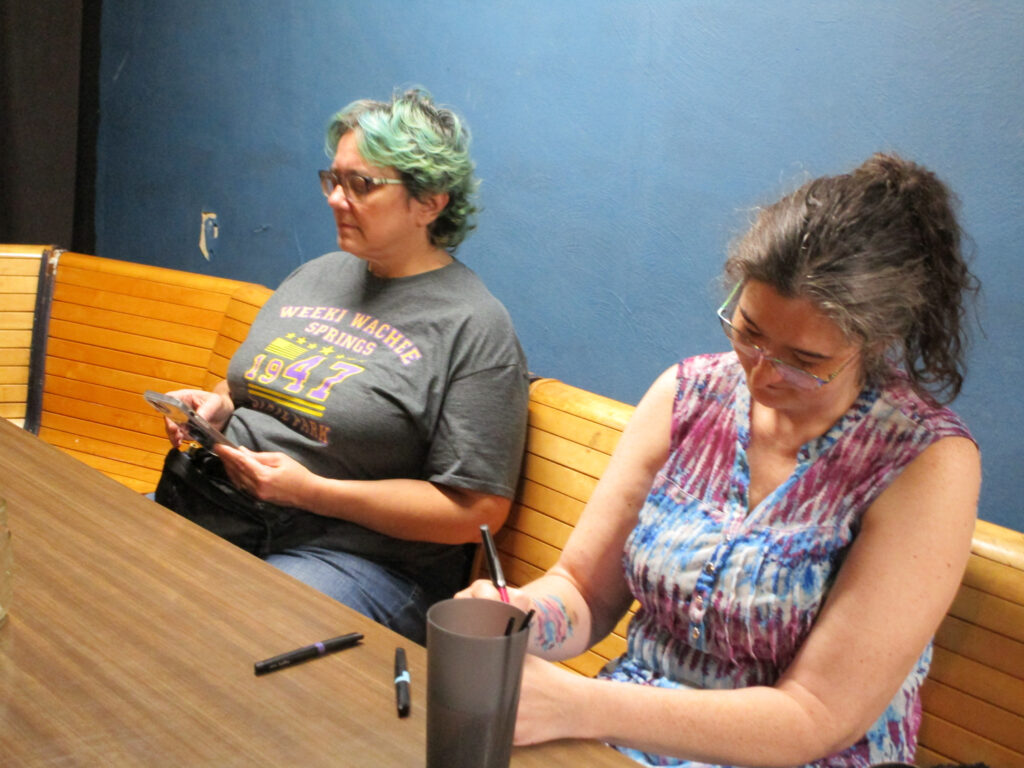 The Smackdown winners Tim (champion) and Heather (undercard winner) brandish their weapons. Yes, I’m wearing my Smackdown button plus last week’s Smackdown buttonand one from Lightning Flippers. I’m a notorious showoff.