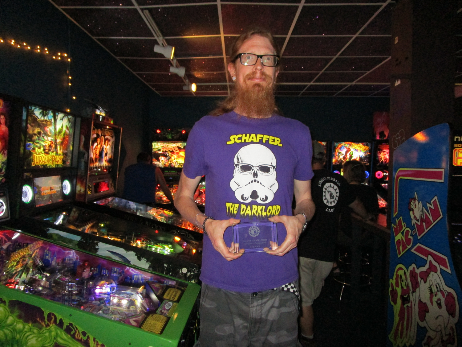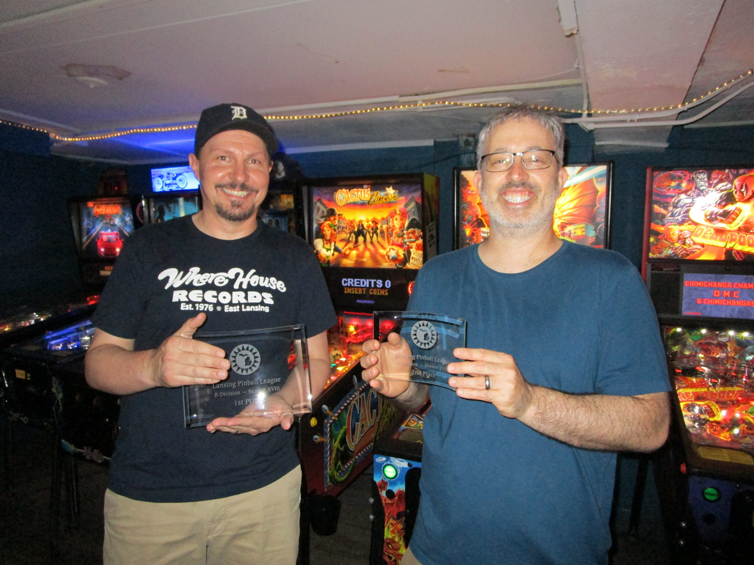 The final match in A division started around midnight and pitted Danny against Jason, with Danny having the better seed. Danny chose Willy Wonka, which he won. Choice then went to Jason, who chose The Munsters and won. Choice went back to Danny and he chose Stranger Things. I have to admit that at this stage I had very mixed emotions. I always find it more exciting when finals goes into a second match, and I also kind of wanted to see a new league champion (Jason has never won the season), but part of me also really wanted Danny to win so that the tournament would be over before they started kicking people out. Danny did win that final game on Stranger Things and it was a few minutes before 1 am when I had him and Jason line up for photos. A single bar patron, who had gotten out of the way for the photo and was standing nearby, clapped. I then packed up my stuff and took Joseph’s car home, as he had long since walked home to go to bed in order to be rested for work the next day.