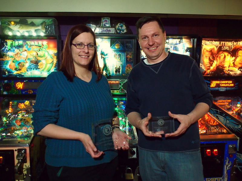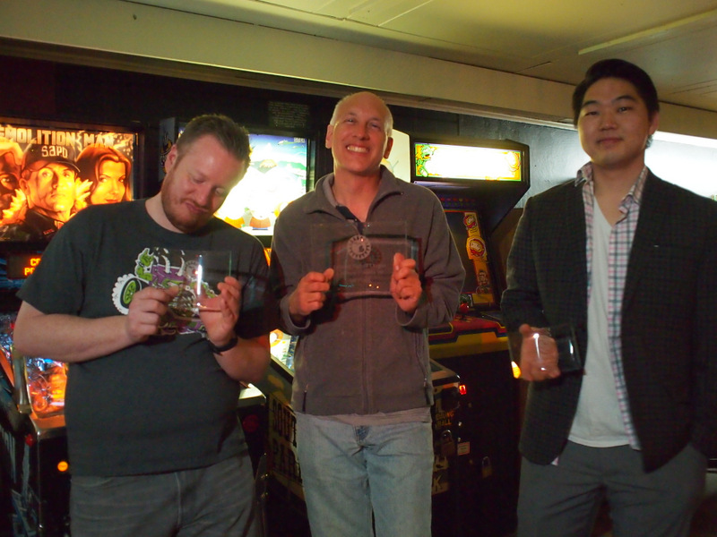 In past seasons, A division has been the top eight qualifiers, but due to the low attendance at finals, Matt put the top six qualifiers who attended into A and the rest in B. Kristen, who returned to the league this season after a long absence, won B division, with Russell in second and Dan in third. Kristen looked very happy and said that this was her first pinball trophy.