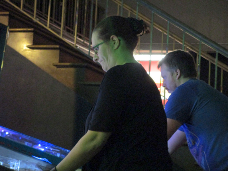 The first time I did a Silver Balls tournament, it was four strikes, and we ended up just barely finishing before the bar closed. This time I was conservative and did three strikes, and we actually got done more quickly than I would have liked. Someday I’ll get this tweaked just right. Mike S. took first place (on a roll after his Zen victory), and two people playing in their first Avenue tournaments got second and third: Derik and Melinda (respectively). Melinda was especially pleased with her Santa-themed trophy, saying that it was the first time she had won hardware in a tournament.